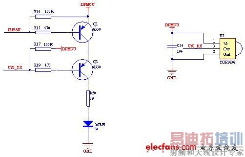根据《CJ/T 188-2004》技术规范文档,超声波热量表红外通信采用38KHz的载波对通信数据进行调制且有效通信距离大于2m,选用波长为940nm的红外发射管与接收管。供热管理人员可以使用手持红外抄表设备对超声波热量表进行抄表。红外通信电路如图5所示。