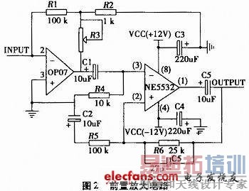 倍;第二级用NE5532运放构成一个低噪声的电压放大电路。NE5532是一种高速低噪声运算放大器。它的带宽为10 MHz,相比大多数标准运算放大器,它显示出更好的噪声性能,更高输出驱动能力和小信号带宽。