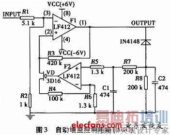 图3中,输入信号从运放F1的同相端输入,二极管VD对运放F1的输出信号整流后,经一个∏形滤波电路得到一个负向AGC电压,这一电压经过运放F2放大后送往场效应管3DJ6的栅极。当输入信号幅值较大时,相应地得到较大的AGC电压,运放F2输出较大的负压至场效应管3DJ6的栅极,增大了场效应管3DJ6的源漏极间的电阻,从而减小了运放F1的放大倍数;反之,当输入信号的幅值较小时,AGC电压也很小,运放F2输出也很小,场效应管3DJ6的源漏极间的电阻很低,使运放F1得到较大的放大倍数。