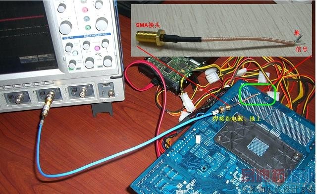 也可以把同轴电缆剥开,直接把电缆的信号和地焊接到待测试电源的电源和地上。在图四中把SMA接头的同轴电缆的一段剥开,焊接到了电脑主板的DDR2供电的1.8V上面,测量其电源噪声。