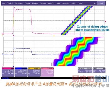 图一:示波器DC的量化误差示波器存在量化误差,实时示波器的ADC为8位,把模拟信号转化为2的8次方(即256个)量化的级别,当显示的波形只占屏幕很小一部分时,则增大了量化的间隔,减小了精度,准确的测量需要调节示波器的垂直刻度(必要时使用可变增益),尽量让波形占满屏幕,充分利用ADC的垂直动态范围。在图一中蓝色波形信号(C3)的垂直刻度是红色波形(C2)四分之一,对两个波形的上升沿进行放大(F1=ZOOM(C2), F2=ZOOM(C3)),然后对放大的波形作长余辉显示,可以看到,右上部分的波形F1有较多的阶梯(即量化级别),而右下部分波形F2的阶梯较少(即量化级别更少)。如果对C2和C3两个波形测量一些垂直或水平参数,可以发现占满屏幕的信号C2的测量参数统计值的标准偏差小于后者的。说明了前者测量结果的一致性和准确性。通常测量电源噪声,使用有源或者无源探头,探测某芯片的电源引脚和地引脚,然后示波器设置为长余辉模式,最后用两个水平游标来测量电源噪声的峰峰值。这种方法有一个问题是,常规的无源探头或有源探头,其衰减因子为10,和示波器连接后,垂直刻度的最小档位为20mV,在不使用DSP滤波算法时,探头的本底噪声峰峰值约为30mV。以DDR2的1.8V供电电压为例,如果按5%来算,其允许的电源噪声为90mV,探头的噪声已经接近待测试信号的1/3,所以,用10倍衰减的探头是无法准确测试1.8V/1.5V等小电压。在实际测试1.8V噪声时,垂直刻度通常为5-10mV/div之间。
