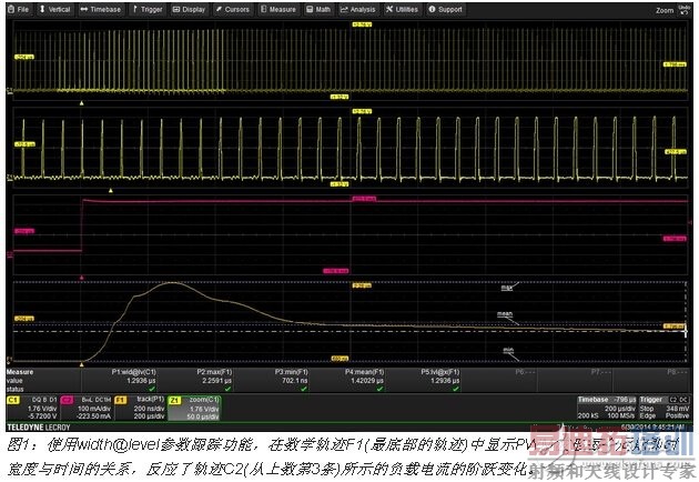 图1显示了作为负载电流阶跃变化(轨迹C2,从上数第3个)响应的PWM控制器输出(轨迹C1,顶部轨迹)的跟踪轨迹F1,即展示width@level 参数与时间关系的(底部轨迹)。缩放轨迹Z1(从上数第2个)是水平方向放大了的随负载变化的控制器输出,展示了脉宽的变化。