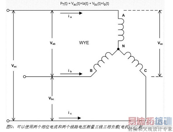 用于测量三相电路功率的双功率计方法可以用四通道示波器来实现。三线三相负载的功耗可以用一个四通道示波器来确定,方法是测量两个相位电流和两个线路电压。举例来说,观察图9所示原理图,三相电机消耗的总功率可以通过测量Vac、Vbc、Ia,和Ib加以确定: