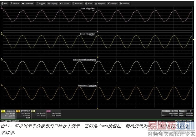 如果波形是重复性的,可以使用随机交织采样——一种等效时间采样方法来增加有效的采样率,并例采样点靠得更近。图11的上方第3条轨迹对此作了展示。如果波形是重复性的,打开显示保留功能将产生仅基于采样值的平滑波形,如图11中下方轨迹所示,其中被称为持久轨迹平均的先进数学工具提供了捕捉持久显示器上每个点均值的能力。
