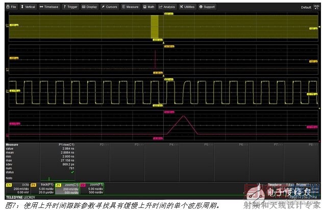 这是全部实例测量的优势。你可以见到以单个周期为基础的波形时序变化。这种技术可以代替使用WaveScan搜索功能寻找具有缓慢上升时间的这种脉冲。