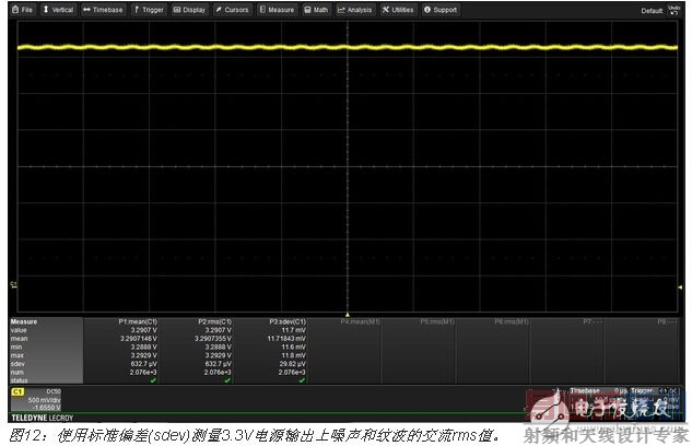 考虑图12所示3.3V电源输出上的纹波和噪声的测量。