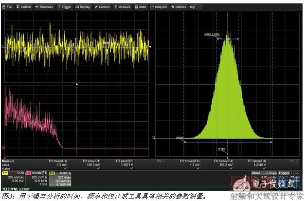 随机过程很难表征,因为没有哪次测量能够提供有关前次或下次测量的任何信息。只有通过观察累积测量结果才能了解到你正在研究的过程。图8显示了用于测量噪声等随机过程的基本工具。左上方的轨迹是通道1输入信号的幅度时间图。左下方的轨迹是功率谱密度图,显示的是噪声功率的频率分布情况。右边的轨迹是单次噪声电压测量的柱状图。这个柱状图显示了单次测量的幅值分布情况。这些分析功能与测量参数一起为噪声测量提供了完整的工具集。