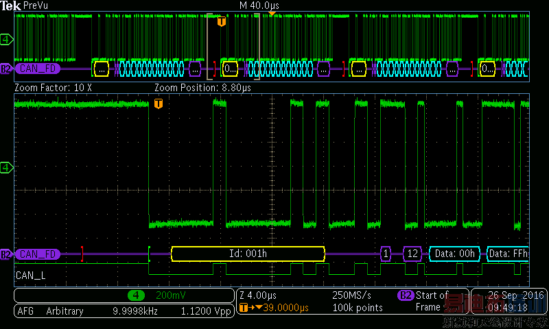 中国北京2016年10月26日讯 – 全球领先的测量解决方案提供商——泰克科技公司日前为MDO3000和MDO4000C系列混合域示波器推出完整的CAN FD协议触发、解码和搜索解决方案,帮助汽车工程师满足消费者对功能更强大、更完善的电子模块和集成系统的需求。汽车制造商正越来越多地采用CAN FD (拥有灵活数据速率的控制器区域网)协议,该协议可以在车内传送更多的数据。
