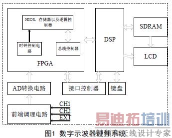 数字示波器主要由前端稳压处理电路、AD转换电路、集成于FPGA芯片的NIOS系统及各种控制电路和SDRAM、各种键盘和LCD接口等组成。其中DSP芯片作为后端处理的核心使用的是TI公司的TMS320F2812.它是32位定点DSP芯片,内含128K*64位的片内Flash存储器18K*16位的数据/程序存储器以及4K*16位的Boot Rom,FPGA芯片作为前端采集控制处理器,使用的是Altera公司的EP2C5Q208,它是Cyclone系列的一款低成本FPGA芯片拥有多达119808bit的内部RAM,4608个逻辑单元,支持Altera公司的NIOSII及SOPC,可满足设计要求。