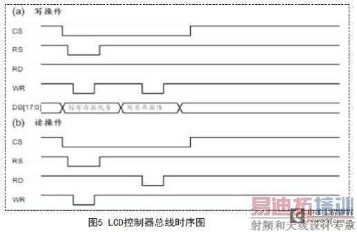 LCD以ILI9320为控制器,ILI9230具有统一的时序逻辑(如图5所示)和非常丰富的指令编码,支持MSP430、51、DSP、FPGA等系列CPU.根据LCD控制器中不同的指令编码和DSP中的数据端口定义,还可以自行设计对LCD的控制指令和编程方式,实现对LCD屏上显示位置、显示内容以及色彩的组合控制。