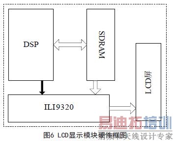如图6所示,DSP通过数据总线与SDRAM的数据交换,把处理后的数据送入显示缓冲区中。同时DSP也可以通过控制总线向ILI9230发送指令,使其从SDRAM中读取数据,并送入LCD显示,这样就完成了一个显示的过程。