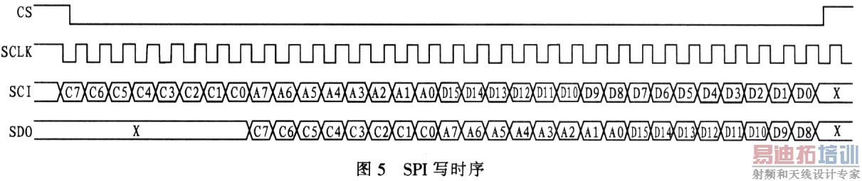SPI接口电路如图4所示,也需用三态门进行转接。其工作时序如图5、6所示。当MLX的片选信号出现一个下降沿时,写命令开始,再出现一个上升沿时写命令结束。其间共有32个时钟脉冲出现,始终上升沿有效。读命令也如此。SDI写命令的顺序是:8位命令、8位地址、16位数据,高位在前;在输入写命令8 个时钟周期后,在SDO口输出输入的命令码、地址码以及头8位数据以供校验用。读命令与写命令基本类似,不再赘述。