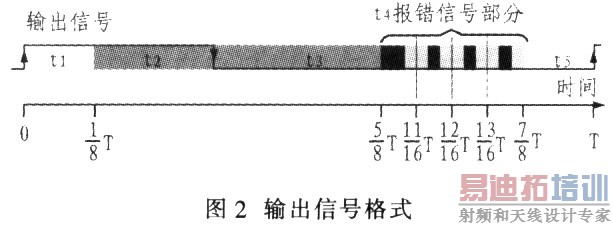PWM信号的典型周期是102.4ms,每个周期始于一段前向缓冲时间t1,该时间段内输出信号始终为1;t2和t3为有效信号部分;t4为报错信号部分,如:传感器温度超过预值、发生某些不可被MLX90313自动修复的措施等;t5为后向缓冲时间,输出信号始终为0。各时段占空比说明如表2所列。
