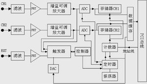 本虚拟示波器系统主要由数据采集卡、计算机和专用的软件组成。 其中数据采集卡完成对输入测量信号的调理采集、缓存,并通过计算机PCI总线送入内存;计算机在应用程序控制下,对数据进行处理、运算,最后完成各种电量测试并在屏幕上用图形或数据形式显示。这一切均可在人机交互方式下完成。