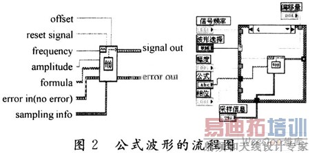 由于虚拟电压表主要用于演示,所以为了方便,可直接利用LabVIEW软件产生仿真信号。在该设计中,设置了正弦波、方波和三角波以及由公式确定的任意波形。在程序设计框图中,使用一个Case(选择)语句对四种波形进行选择。Case语句中,每一个数字(0,1,2,3,4)都代表一种波形,与前面板控件中5种状态相对应。至于Case语句的制作,只需将4个图标中的一个,例如正弦波发生程序,用Case框起来,然后在上面的空白处写上相应的数字,例如1;然后点击箭头,可以设置第二个图标,如果要添加一个Case的话,可以点击鼠标右键,直接添加,编辑相应的基本信号发生器VI中相应的节点即可。在添加公式波时,要把基本信号发生器VI换成公式波形VI,0代表默认状态,表示无任何波形输入。本文给出了Case结构的一个分支,公式波形的流程图如图2所示。该子Ⅵ可使用指定时间函数的公式字符串生成一个函数波形,它要求公式的自变量必须是t,它所支持的运算符和常用的函数。