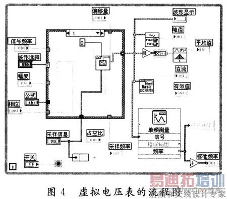 用一个while条件语句设计整个框图程序,当模拟电压开关为“1”时,虚拟电压表工作,条件语句中的程序开始运行;当模拟开关为“0”即关时,条件语句中的程序停止运行,虚拟电压表不工作。设计好的流程图如图4所示。