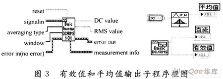 图3中,DC value为测量的直流分量;RMS为value测量有效值;reset用于重启过去记录的时间信号、平均测量的参数;averaging type是测量中的平均类型,在单个模块VI中,可依据输入记录长度自动设置平均时间;Window是在DC/RMS计算之前,用于记录时间的窗;erroe in是在该VI运行之前描述错误环境,默认值为no error。如果错误已经发生,该VI在errorout端返回错误代码,子VI在无错误时才正常运行。