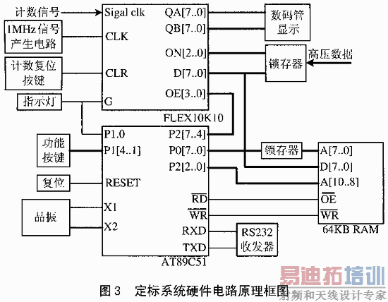 利用单片机AT89C51来进行即时的控制和相应的显示数据。同时根据需要,选择部分测量数据(包括此次计数数据及对应的高压值)存储到RAM中,然后将所选取的RAM中的数据通过RS232串行端口发送到PC机上,经过相应的处理软件进行描图,以及相应的实验数据处理。为了使系统更加集成化,特定时脉宽门控、计数测量电路、地址译码及数据锁存、总线的驱动等电路集成到1片FLEX10K的FPGA中。图3为系统详细电路原理框图。