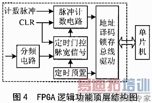为了简化设计,实现系统大量逻辑电路的集成,在设计中使用了现场可编程逻辑门阵列器件(FPGA)。FPGA主要实现以下逻辑功能:定时脉宽门控、计数测量、地址锁存、译码、总线的驱动和扩展以及数码显示的控制等功能。其逻辑功能顶层结构如图4所示。FPGA器件选择Altera公司FLEX10K10系列的EPF10K10LC84-4芯片。该芯片集成有1万个等效逻辑门,含有572个逻辑单元(LEs)、72个逻辑阵列块(LABs)、3个嵌入式阵列块(EAB s),并具有720个片内寄存器,可以在不占用内部资源的条件下实现6144 bit的片内存储器;内部模块间采用高速、延时可预测的快速通道连接;逻辑单元间具有高速、高扇出的级联链和快速进位链;片内还有三态网络和6个全局时钟、4个全局清零信号以及丰富的I/O资源;每个I/O引脚可以选择为三态控制或集电极开路输出,可以通过编程控制每个I/O引脚的速度以及I/O寄存器的使用。