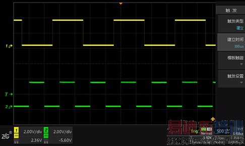 为了判断数据传输的建立时间和保持时间是否符合设计要求,我们采用建立/保持的触发方式,按下【Trigger】键,将触发方式设为普通,触发类型设为建立/保持,然后设置对应的时钟通道和数据通道,采样类型分为上升沿和下降沿,此处的边沿是指您可以指定在何种时钟边沿对数据进行采样。我们选择上升沿,数据类型可选高电平和低电平,我们选择高电平,选中下一页软键,在此处的触发类型中我们先选择建立,接下来就是设置建立时间,根据自己的需要设定合适的建立时间,旋转旋钮A微调,旋转旋钮B粗调,我们设为300us,在建立时间小于所符合设置时间时就会触发,通过时钟的边沿来寻找所需要的高低电平。