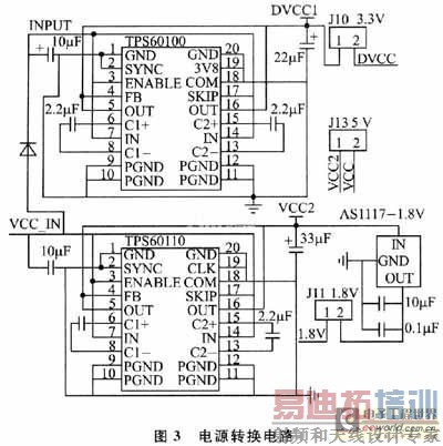 为了得到3种规格的电压(5 V、3.3 V和1.8 V),需要对锂电池的输出电压实行电平转换,这里选择TPS601lO和TPS60100两款集成DC-DC的电荷泵芯片。TPS60110能输出5 V±0.2 V的电压,TPS60100能输出3.3 V±O.132 V的电压。两款芯片具有如下特点: