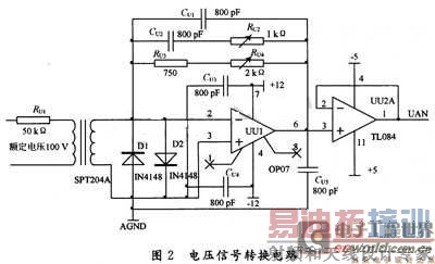 电流信号转换电路和电压信号转换电路类似,电压信号转换电路如图2所示。电压互感器的原边100 V,副边输出2 mA电流经OP07转换成-3.5~+3.5 V的电压量。D1和D2对运放OP07进行输入限幅保护,C2,R2,R3和R4为互感器相移补偿电路,C1,C4和C5用来去耦和滤波。运放TL084 构成电压跟随器,起到阻抗匹配的作用,同时还有缓冲、隔离和提高带载能力的作用。低通滤波器的设计用MAX 274实现,TL084的输出接MAX 274的INA引脚。下面重点介绍由MAX 274设计低通滤波器的过程。