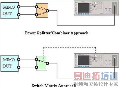 所述,因MIMODUT内有额外的发射器和接收器,且MIMO有特定的测试要进行,因此需要执行一些额外的量测。所需的测试方法不仅要能执行额外的测试,还要能维持量测的正确性。使用多部OBT可以达到这样的目的,然而,这种方法的成本对许多制造商来说可能太高了。另一种方法是使用单一部OBT,并设计一种方法来连接DUT和OBT,目标是要将量测速度最佳化并兼顾量测的正确性。有两种做法可供参考: