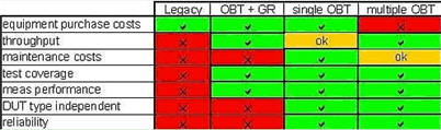 从生产测试的角度来看,採用单一部OBT是最简单的方法,完全没有使用GR的缺点,而且可以提供传统方法具备的所有其它重要的量测能力。然而,必须要去瞭解的是:要用什么方法才能维持测试时间在可接受的范围,且能涵盖所有的MIMO测试项目。