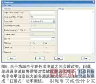 该测试仪具备C/C++应用程序接口(API),来简化测试脚本和自动化测试软件的编写。另外,该系统具有图形用户界面(GUI),后者设计用于GPS DUT的人工测试(见图5)。借助该系统,用户能选择空间载体数量、功率电平、输出模式、多普勒频率、C/A率、源频率。