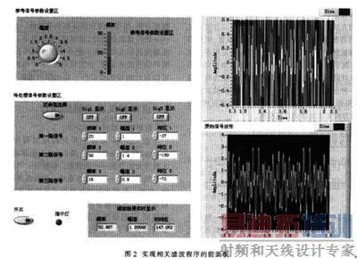 上述实现相关滤波的基础上,还可以进一步改进,使程序更加简单。改进后的前面板如图4所示,将多路信号集于一个图中显示,更加直观。同时增加了粗调和细调旋钮,显得更加精确。改进后的前面板结构更加紧凑,设计也更加合理。