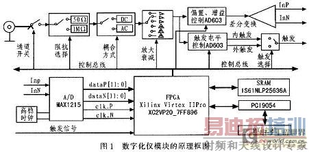 数字化仪模块主要由前端信号调理通路、模数转换电路、数据存储单元、数据采集控制电路、PXI接口电路等部分组成,其原理框图如图l所示。