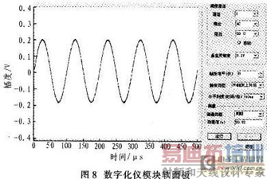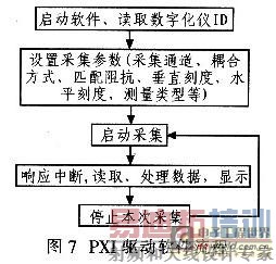 PXI的软件要求包括支持Microsoft Windows NT和95(WIN32)这样的标准操作系统框架,要求所有仪器模块带有配置信息(configuration information)和支持标准的工业开发环境(如NI的LabVIEW、LabWindows/CVI和Microsoft的VC/C++、VB和Borland的C++等),而且符合VISA规范的设备驱动程序(WIN32 device drivers)。本设计应用KRF-Tech公司的Windriver来编写设备驱动程序,Windriver针对PLX和AMCC的专用接口器件编写了API函数包,降低了开发难度。驱动程序的软件流程图如图7所示,图8是本数字化仪模块软面板的界面,对数字化仪的所有控制都可以通过设置该虚拟软件界面来完成。