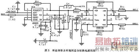 本设计中。A/D转换器选用Mamix公司的MAXl215,该芯片是一款12 bit/250 Ms/s的高速A/D转换器,它具有出色的SNR和SFDR特性,使用250 MHz差分采样时钟,接收差分输入信号,输出12位LVDS格式的差分数字信号,提供差分同步时钟信号。为了提高测试精度,单端的输入信号需要转换成差分模式后再送入A/D,增益调整及单端到差分转换电路的局部如图5所示。考虑阻抗匹配问题,在单端信号转换为差分模式时,需要在2个差分线上串联50 Ω的匹配电阻,作为LVDS信号的发送端。