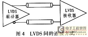 低压差分信号LVDS(Low Voltage Differential Signal)标准是一种小振幅差分信号技术,它使用非常低的幅度信号(100~450 mV)。通过一对平行的PCB走线或平衡电缆传输数据。在两条平行的差分信号线上流经的电流方向相反,噪声信号同时耦合到两条线上,而接收端只关心两信号的差值,于是噪声被抵消。由于两条信号线周围的电磁场也互相抵消,故差分信号传输比单线信号传输电磁辐射小很多,从而提高了传输效率并降低了功耗。LVDS的输入与输出都是内部匹配的,采用直连方式即可,连接方式如图4所示。
