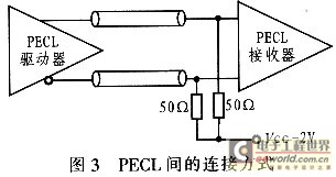 高速数据采集系统的输入输出接口设计是尤为重要的,高速IC芯片的相互连接是决定数据采集系统稳定性的关键因素之一,低功耗及高的信噪比是有待解决的主要问题。通常实现高速采集系统中芯片间互联有两种接口:PECL和LVDS。正电压射极耦合逻辑PECL(Positive Emit-ter-Coupled Logic)信号的摆幅小,适合于高速数据的串行或并行连接,PECL间的连接一般采用直流耦合,输出设计为驱动50 Ω负载至(VCC -2V),连接电路如图3所示。