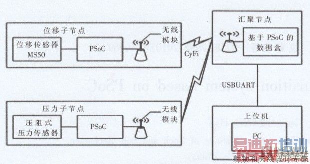 系统分为数据采集部分与数据上传部分。数据采集部分由5个子节点和1个汇聚节点通过CyFi无线传输技术组成。其中,子节点又分为4个位移子节点和1个压力子节点。子节点的核心控制单元是PSoC可编程片上系统,负责接收传感器数据并控制CyFi无线模块发送。另外,位移传感器采用数字容栅式MS50传感器,输出量为数字信号。压力传感器采用压阻式压力传感器MPM480,输出量为模拟信号,需进行A/D转换。