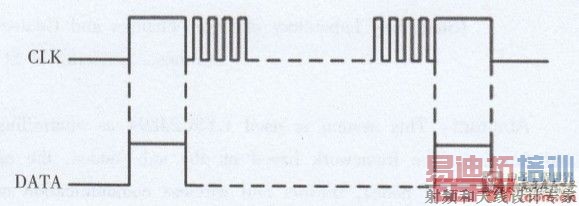 本设计中位移子节点采用岩土工程监测中常用的数字容栅式位移传感器MS50,其分辨率为0.01 mn1,精度为±0 03 min,电子容栅式位移传感器MS50的输出信号如图2所示,分为CLK和DATA两路信号进行传输⊙由示波器检测输出信号可知:信号的头尾为标志位,且为4位高电平值。位移传感器MS50每250 Ins传输一帧48位的数据包,这个数据包由各分为24位的两组数据组成。其中,后一组数据为前一组数据减去基准零值后的差值,即为前一组数据的倒相输入。
