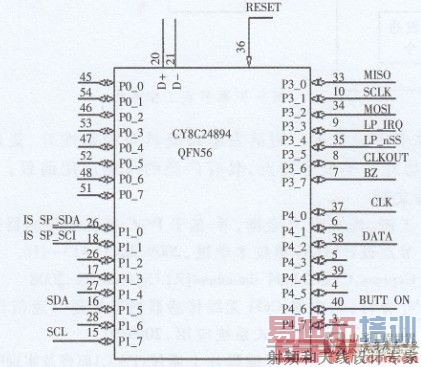 CY8C24894是一种高速低功耗的芯片,内含的M8C处理器工作频率最高可为24 MHz,工作电源为3.3 V或5 y。CY8C24894内含1个XRES引脚支持系统内串行ISSP编程和外部复位控制。并且,CY8C24894不需要外部晶振驱动便可以开始工作。CY8C24894包含7个lO端菅口:Port0、Polt1、Polt2、Port3、Port4、Port5 和 Port7,共49个GPIO。模拟系统包括2列6个可编程模拟模块和模拟互联逻辑,数字模块包括1行4个可编程数字模块和数字互联逻辑,另CY8C24894片上还集成了16 KB的Flash程序存储器,1 KB的SRAM数据存储器。