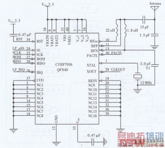 射频芯片采用CYRF7936芯片,为40引脚的QFN封装芯片。工作的ISM频段为2.4 GHz~2 483 GHz,工作电压为1.8 V~3.6 V,支持速度为4 MHz的sPI微控制器接口,需外接12 MHz的晶振。