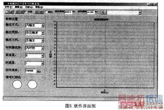 用户程序设计部分则是基于C++Builder开发平台,设计并实现数据采集系统的功能。系统软件总体上包括数据采集(通道控制、触发控制)、波形显示、参数测量、频谱分析及波形存储与回放等五大模块。软件界面如图5所示。