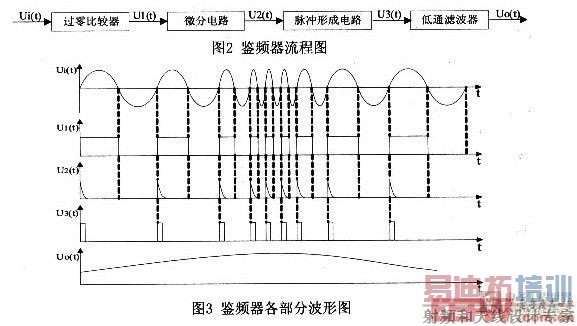 信号调理部分由脉冲计数式鉴频器完成。它由四部分组成(如图2所示),即过零比较器、微分电路、脉冲形成电路和低通滤波器,输入的调频波Ui(t)经过零比较器后变成调频方波信号U1(t),调频方波信号通过微分电路后变为微分脉冲序列U2(t),微分脉冲序列经过脉冲形成电路后变为等脉宽的方波脉冲序列U3(t),等脉宽的方波脉冲序列通过低通滤波器后就输出调制信号Uo(t)。鉴频器各部分的波形如图3所示。