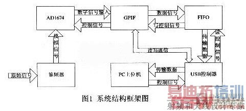 本设计采用的主控芯片是Cypress公司的USB2.0控制芯片CY7C68013,它与计算机通过USB接口相连,使设备能在PC机的控制下进行操作。USB主控芯片通过逻辑控制电路连接到FIFO和A/D转换后的数据传送至FIFO芯片进行缓冲,缓冲后的数据输入主控芯片的从FIFO中,然后从FIFO以DMA(直接内存存取)的方式经由SIE(串行接口引擎)传给PC机。