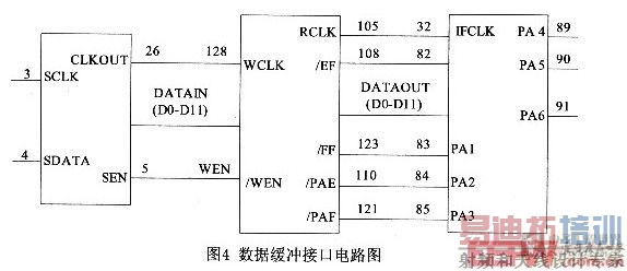 由于A/D最高采样频率可达100MHz,而主控芯片CY7C68013中的FIFO只有4kB,不能满足A/D数据转换器的要求,因此需要在A/D和CY7-C68013之间增加一个高速的FIFO来缓存数据。FIFO是先进先出的数据缓存器,数据在其内部顺序写入、顺序读出,其数据地址由内部读写指针自动加1完成。它具有双口输入输出、采集传送速度快等特点,能满足高速数据传输的要求。由FIFO构成的数据缓冲电路主要部分的接口电路如图4所示。