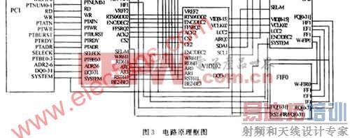 图3中PCI模块包括PCI总线和S5933的接口,S5933是PCI总线专用控制芯片,用它的FIFO通道和PASS-THRU通道进行数据传输理论上都可以达到PCI总线的峰值速率,使利用ADV611实现多路视频信号的实时监控、存储成为可能。