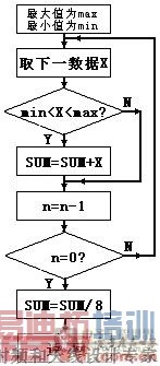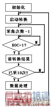 主要子程序模块包括:系统初始化、a/d转换程序、平均滤波子程序、标度变换子程序、二进制转bcd码子程序。主程序流程图如图4所示。为了防止病人由于咳嗽等偶然原因造成的腹腔压力陡变影响,在数据处理方面,采用了平均滤波方法以减小偶然误差。图5为平均滤波子程序流程图。该子程序采用平均滤波的方法进行数据处理,即将连续采样10次的数据去掉最大值和最小值之后进行累加求和,按8次采样值取平均数,即得有效采样值,存入发送缓冲区。