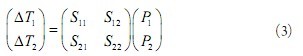 这里,Sij (i, j=1,2)是热敏感度系数,与热阻的度数相同,Pi是每个热源的功率损耗。