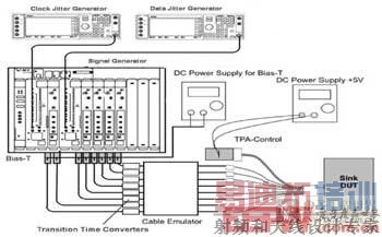 在HDMI 的CTS1.3b的规范中,要求在Sink的抖动容限测试中除了加入两种频率的抖动外,还需要加入TTC(transition time converter)以及Cable emulator以保证信号的上升时间以及抖动成分符合规范要求。数字信号源使用如图9所示的方式来实现。