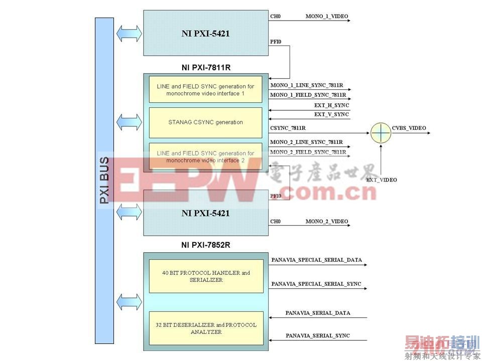 图1. 测试站上PXI模块的系统连接框图,用于开发视频和串口通讯功能