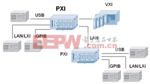 开放的PXI/PXI Express平台也提供用于与VXI系统或分立仪器进行通信的标准硬件和软件,包括GPIB、USB、LAN、Serial等接口。事实上,许多实际的测试系统都不是基于单一总线的,而是一个混合总线系统,比如既有PXI设备,又有基于GPIB的传统仪器,但是PXI更适合作为这种混合总线系统的核心。一方面,作为一种内部总线,PXI具有最大的数据传输速率和最低的延时,保证其不会成为整个系统数据传输的瓶颈;另一方面,PXI平台的硬件基于标准PC技术(如PCI/PCI Express总线、通用的CPU和外围设备,同时主流的Windows软件构架对用户来说也非常熟悉),基于PXI系统进行自动化测试系统的开发和操作就像使用标准的基于Windows的PC机一样方便,也便于升级维护。NI一直免费提供业内最大的仪器驱动程序库,并持续对其进行更新。任何人只要访问ni.com/idnet即可下载8000多种仪器驱动程序,快速实现与基于各种总线的第三方设备之间的连接通信。