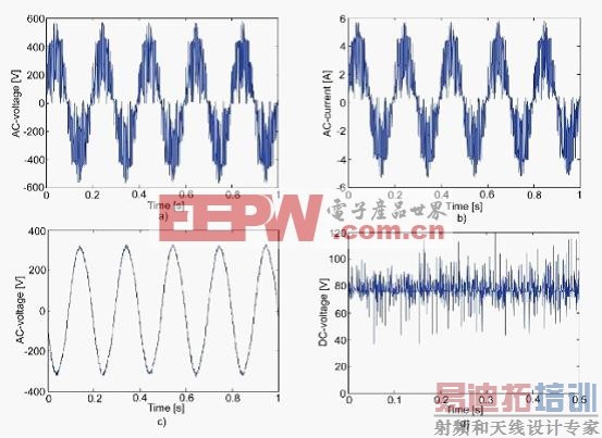 图 4:在乌普萨拉(Uppsala)进行的最终测试的电流和电压测量结果:a)测量到的交流电压,负载=107欧姆 b)测量到的交流电压,负载=107欧姆 c)通过变压器之后测量的交流电压,负载=36微法//107欧姆 d)通过变频器之前测量的直流电压。